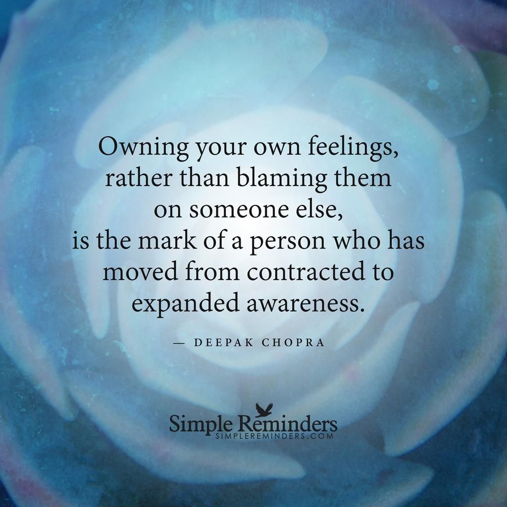 When we own our feelings, we take responsibility for how we have chosen to react to any given situation. Yes, there will be times when we feel angry or frustrated, hurt, disappointed or sad. There will be times when we feel elated, happy, excited or ecstatic. Own all the feelings, good and bad. You are entitled to both. Own your feelings. Do not give anyone else the power to “make” you feel any given way. Your feelings are your own. You are responsible for them and for the way you express them. If you need to cry, remember that it is okay to cry. Let the tears come, let them cleanse your soul. If you need to laugh, do so with a happy heart.