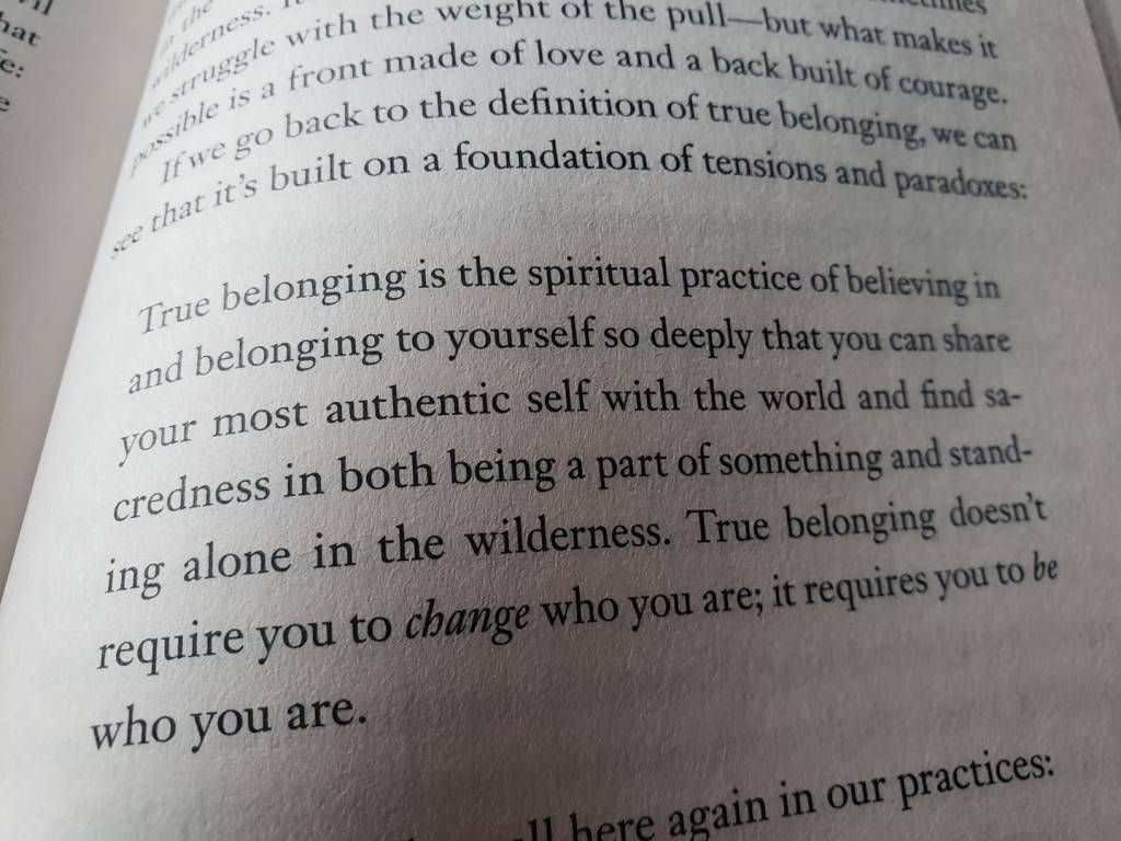 Read that: True belonging doesn’t require you to change who you are; it requires you to be who you are. That means that we do not massage our values to fit in with any particular group or sect. That means that we hold true to our values, whatever they may be, even in the face of adversity. True belonging requires us to dig deep and really come to know ourselves as the sometimes flawed, perfectly imperfect beings that we are. Yes, that may be frightening, but if we do not belong to ourselves how can we possibly feel as though we belong anywhere in the world?