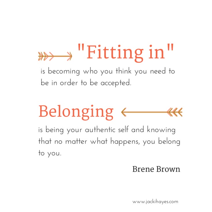 This all begs the question of, what is the difference between fitting in and real belonging? For one thing, real belonging requires equal measures of vulnerability and compassion, something many people shy away from or outright reject because both vulnerability and compassion can be downright scary. Fitting in is different. Fitting in usually offers less depth, yet somehow requires more effort and can cause more anxiety than true belonging. When we strive to fit in with a certain group of people, we can find ourselves working hard to become like the people we are trying to fit in with, often to our own detriment. That alone can be exhausting, particularly if the people we are trying to fit in with are different in their beliefs, values, interests or ideals.